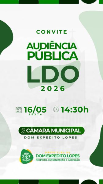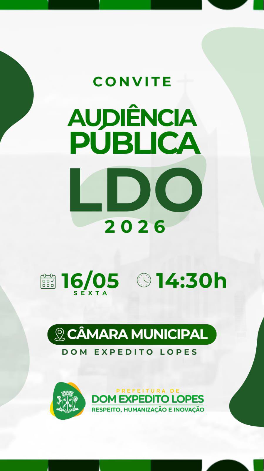 Data: 15/05/2025A Prefeitura de Dom Expedito Lopes realizará, nesta sexta-feira, dia 16 de maio, às 14h30, uma audiência pública na Câmara Municipal de Vereadores para discutir a Lei de Diretrizes Orçamentárias (LDO) para o exercício de 2025.