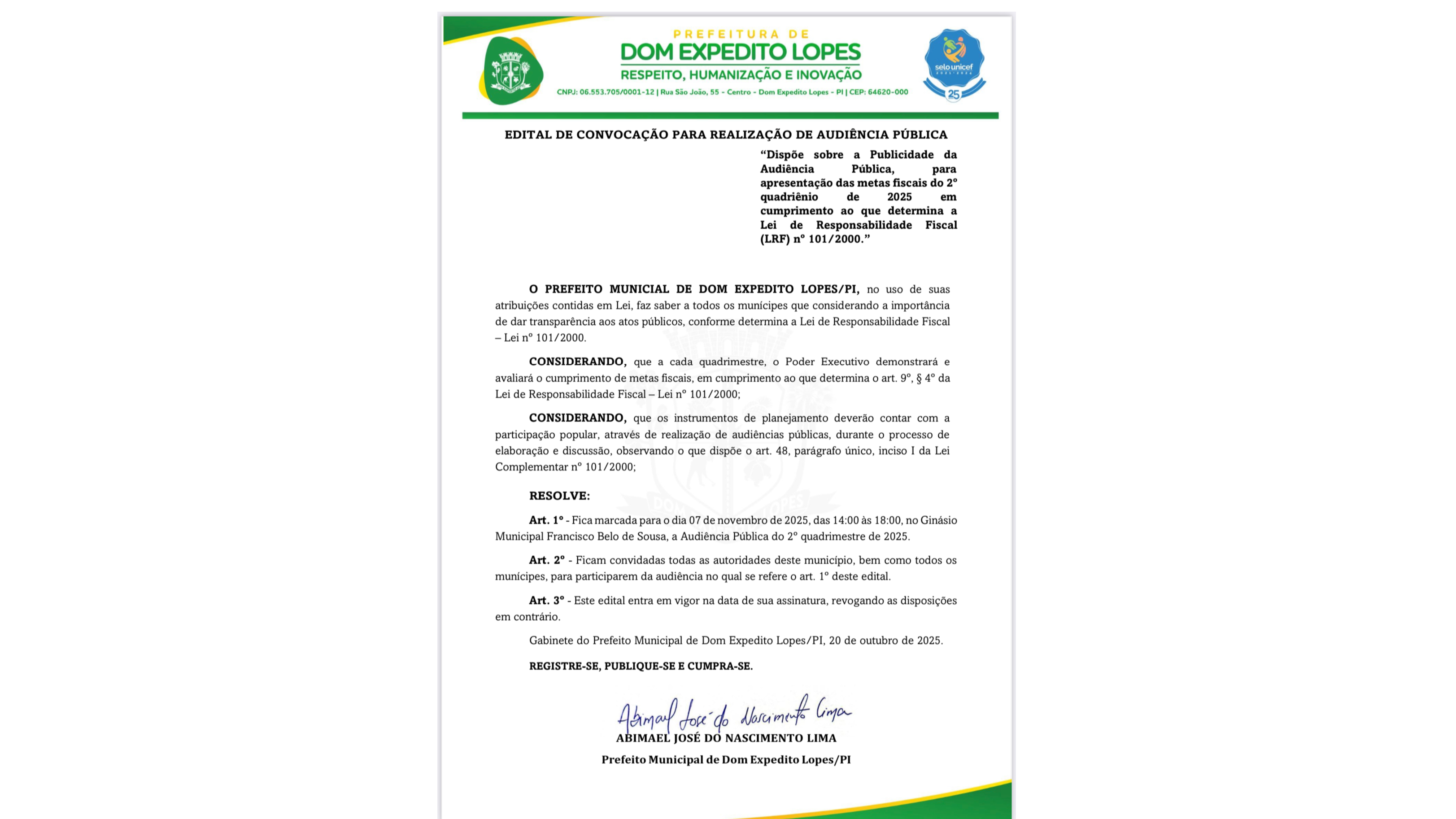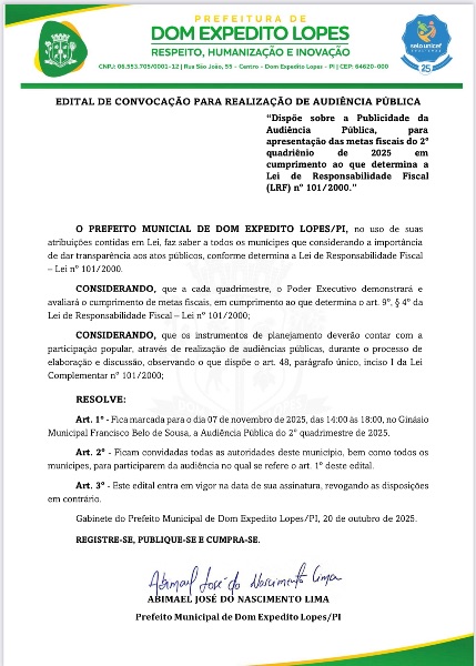 Edital de convocação para realização de Audiência Pública. Confira